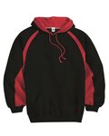 Badger Hook Hoody. Contrast underarm and sleeve inserts. Contrast rib trimmed two-ply hood with contrast liner and drawcord. 9.5 oz. Ringspun 60% cotton/ 40% Polyester. Plate-patch at neckline with room to embellish. Spandex reinforced rib knit cuffs and waistband. Embroidered badger logo on left sleeve. Pouch front pocket with headset opening.